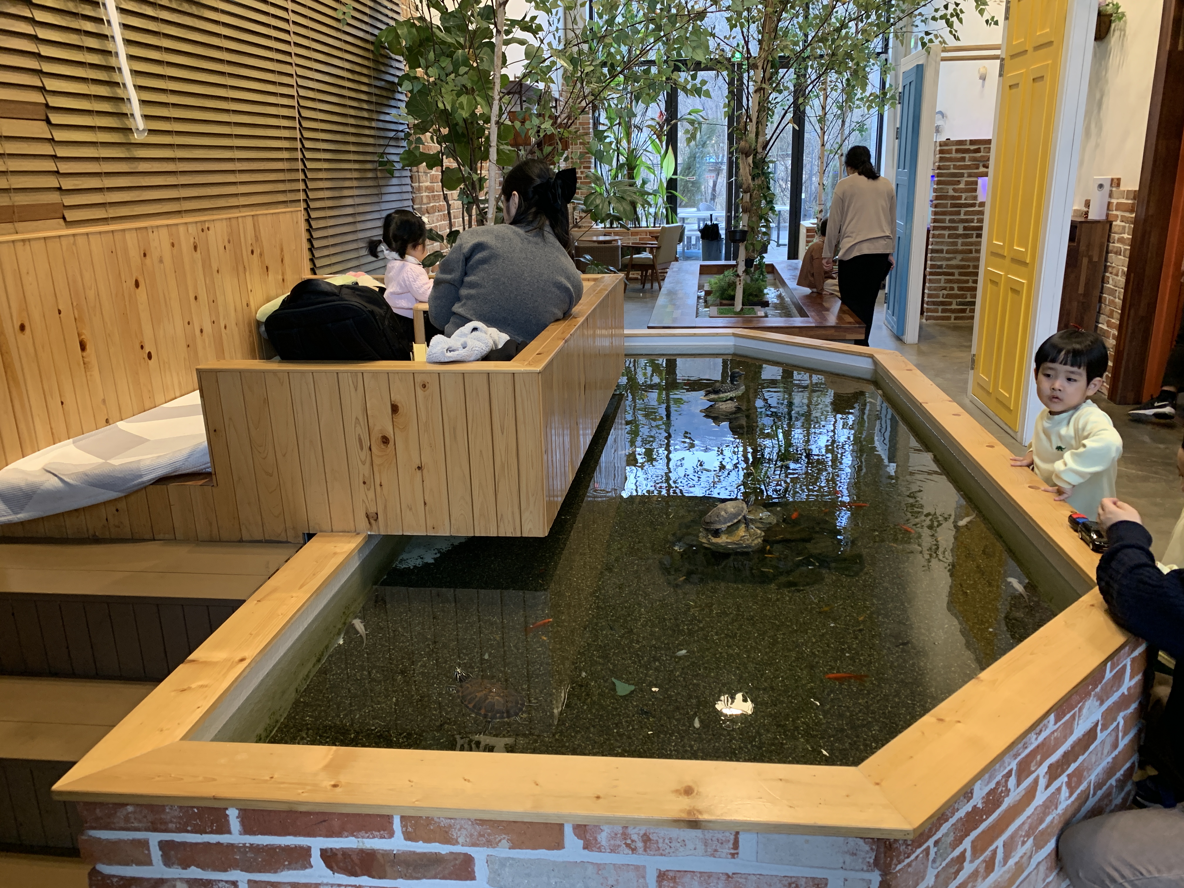 테이블 밑에서 돌아다니는 물고기와 거북이들을 구경하는 우리 딸을 볼 수 있었다.