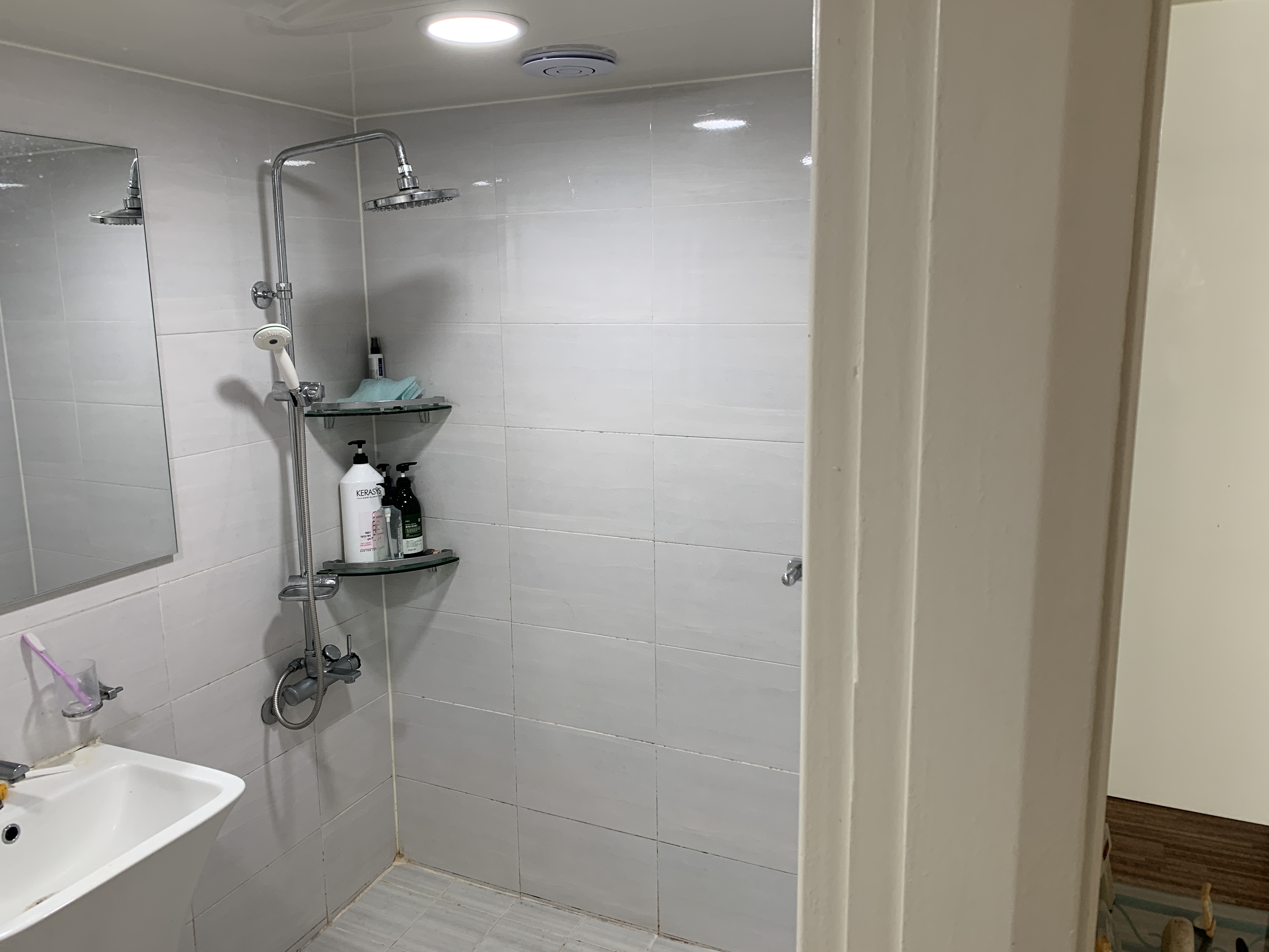거울에 건설사 이름이 떡 박혀 있었단 말이지.. 거실 화장실은 한 번은 고친 거 같은데 이 화장실은 어떻게 변했을까. 거실 화장실은 기존에 욕조가 없었는데 욕조를 신설하여 지금은 아이와 함께 같이 목욕을 즐기는 곳이다. 아이도 신나서 소리 지르고, 좋아하고 우리도 같이 놀고이 전에 살던 집은 욕조가 없었다.. 좋아하던 반신욕도 못했어서, 이사 와서는 일주일에 2번 정도는 반신욕을 하고 있다.