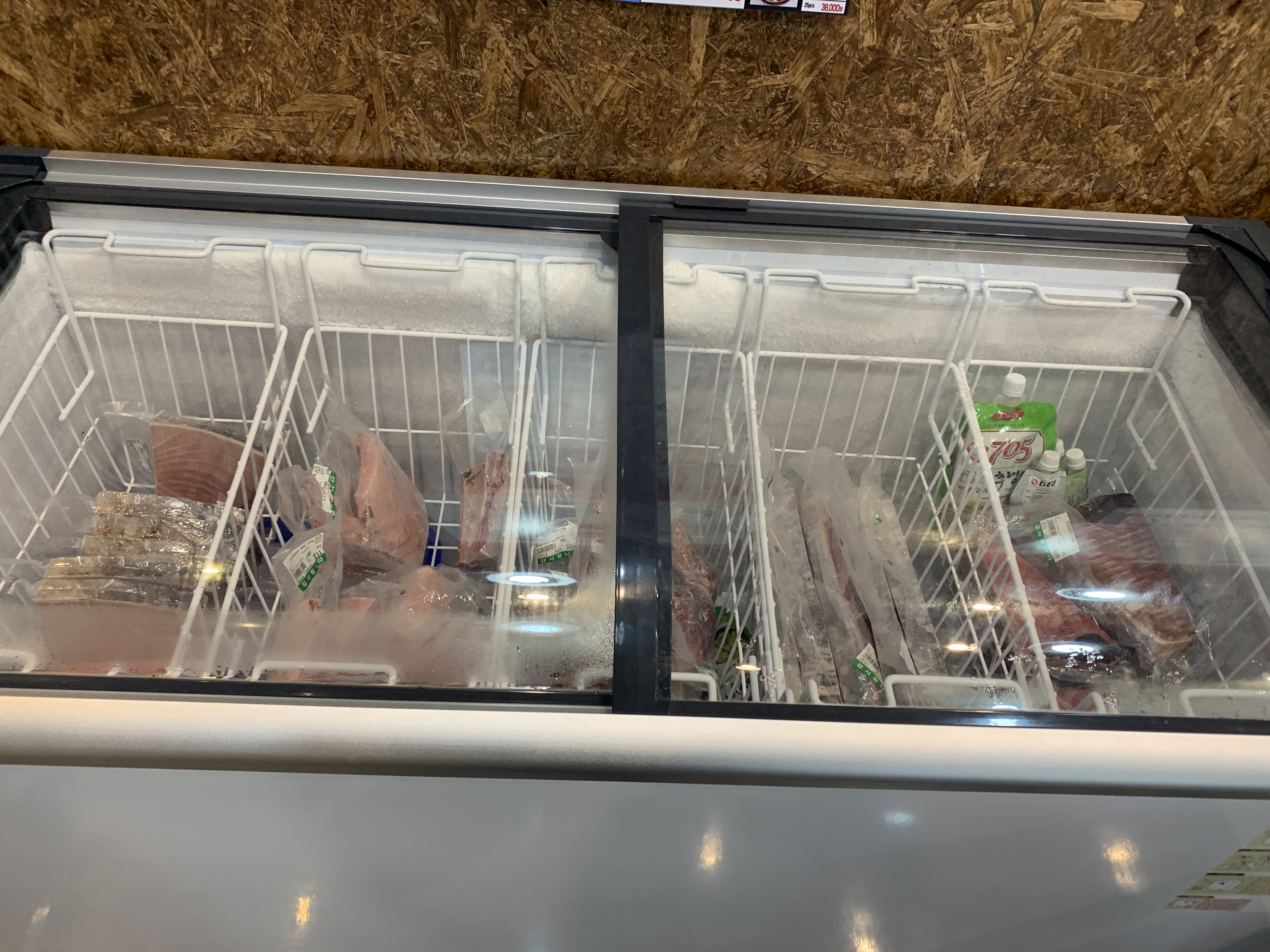 그 밑에 냉동고엔 부위별로 덩어리채 팔기도 한다.