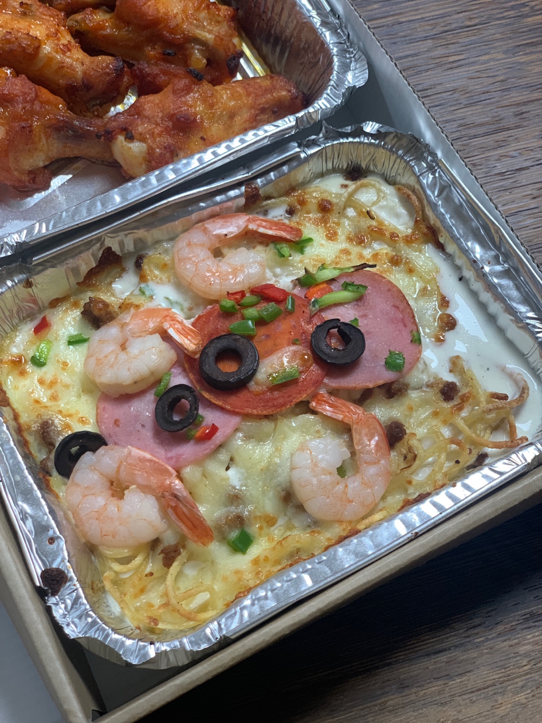 피자(M) + 스파게티 + 핫봉(6개) + 감자튀김 + 훈제치킨(반마리) + 콜라