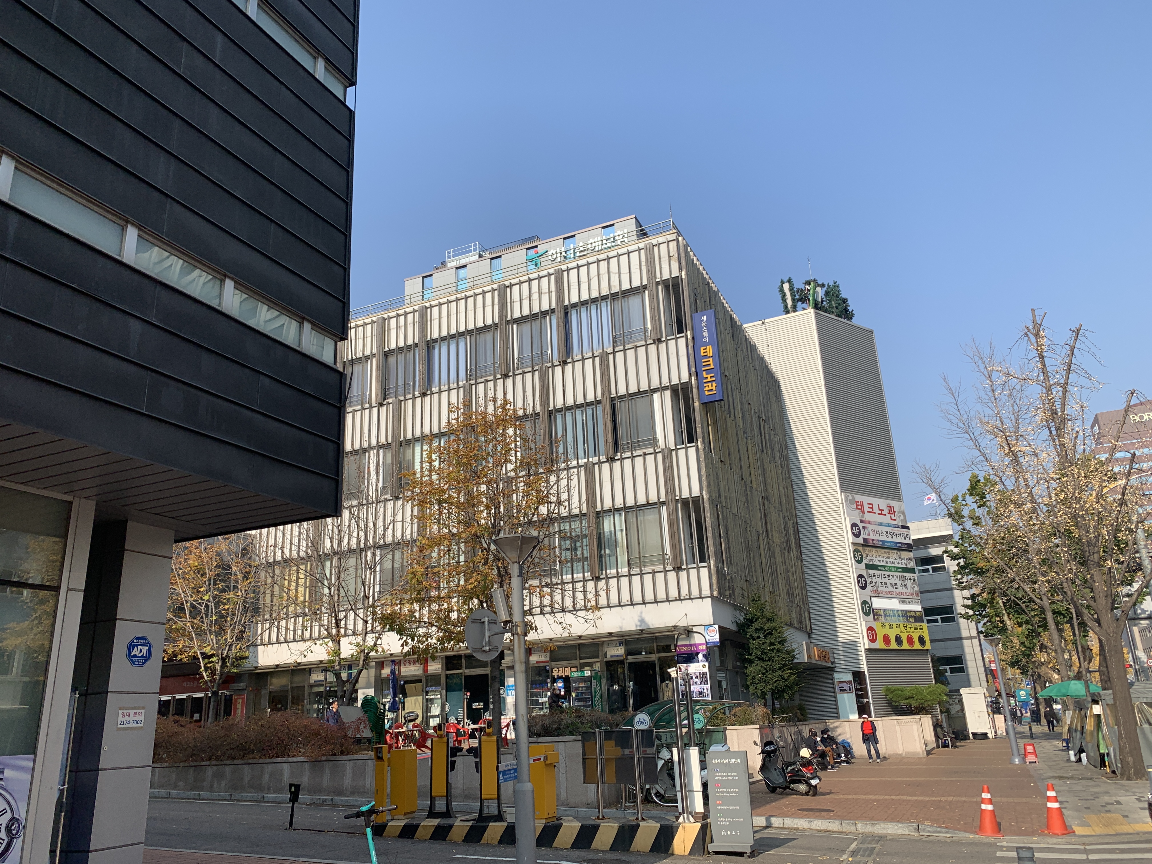 파란색 간판의 테크노관이 보인다.