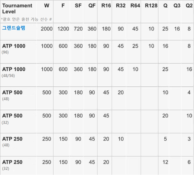 오늘은 ATP 250 / 500 / 1000 / 그랜드 슬램, 그리고 다른 주요 토너먼트에 대해 정리해 보겠습니다.