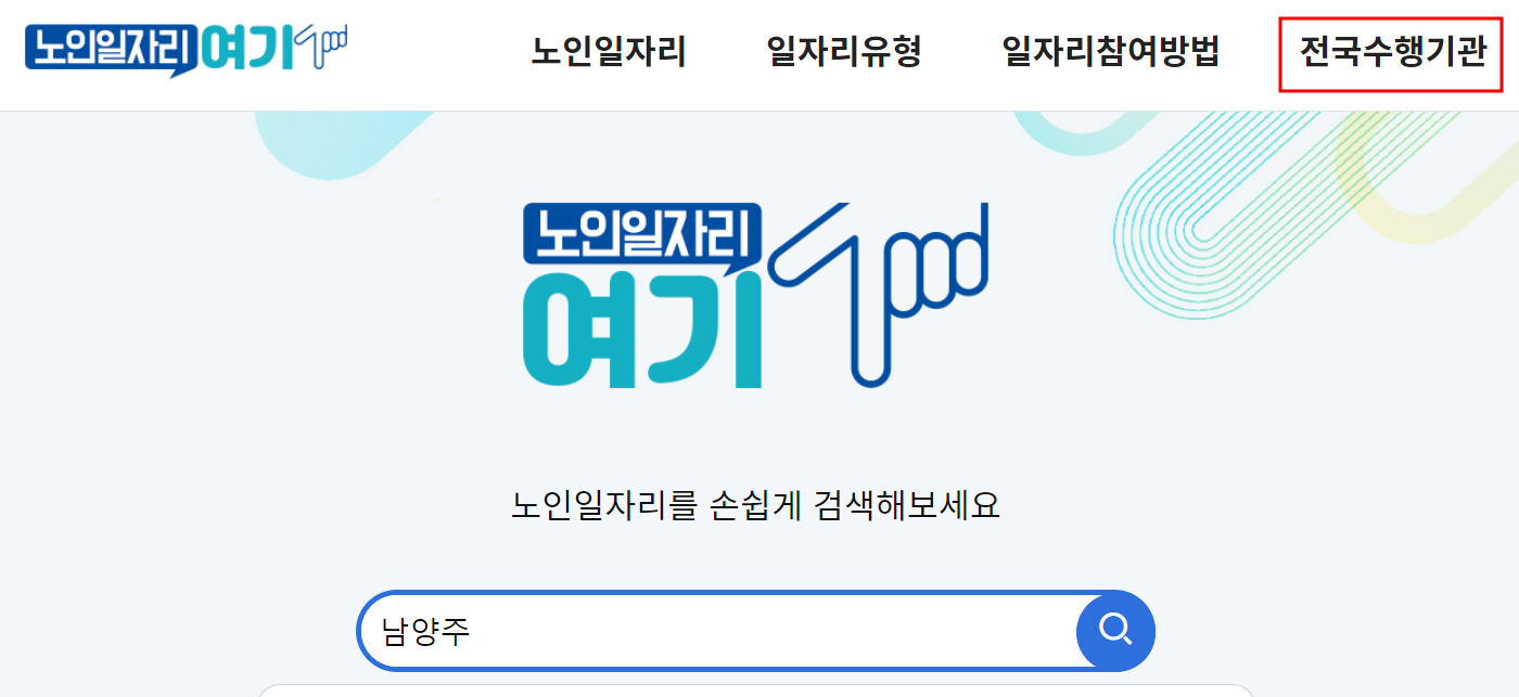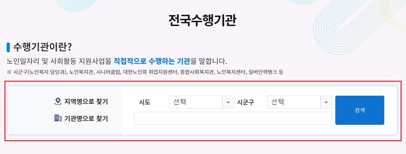 ※ "노인일자리여기" 사이트에서 각 지역별 수행기관을 검색할 수 있는데요.